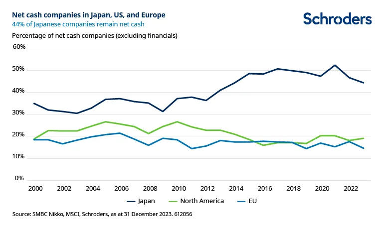 La buena noticia es que las empresas japonesas están bien situadas para adoptar algunas o todas estas medidas. El porcentaje de empresas con "tesorería neta" (es decir, cuyo efectivo en el balance es superior a su pasivo) es del 44%. Eso da a esas empresas margen para invertir en su negocio, o aumentar la rentabilidad para los accionistas, o ambas cosas.
