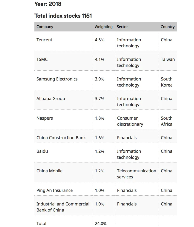 Otro dato llamativo es saber cómo han cambiado las 10 principales acciones de este índice desde 1998. En ese año, siete de las 10 procedían de compañías latinoamericanas, mientras que hoy en día, las 10 principales acciones pertenecen a empresas asiáticas.