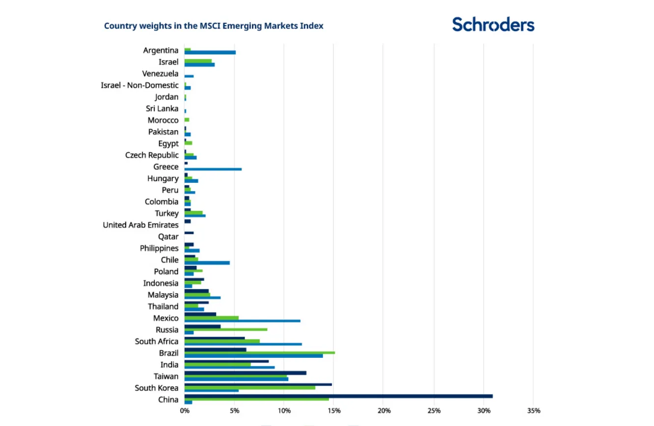 Corea del Sur también ha visto aumentar su peso desde el 5,5% en 1998 hasta el 9,4% en la actualidad. En parte debido al aumento de China, la importancia de mercados como México, Brasil y Sudáfrica ha sido moderada.