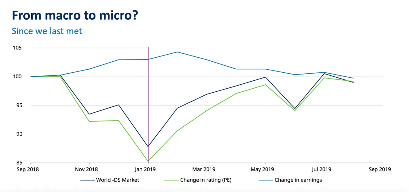 En esencia, durante los últimos 12 meses hemos tenido un mercado de renta variable más débil, lo que ha provocado una gran disminución de las valoraciones a la baja, seguida de un aumento prácticamente equivalente de éstas. Por ello, los beneficios por acción (PER) se han mantenido sin grandes cambios.