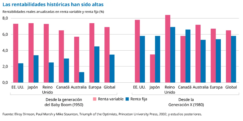 Los gráficos de más abajo muestran que las rentabilidades de la renta variable han sido considerablemente elevadas en todas las regiones y los rendimientos de los bonos especialmente sólidos desde 1980.