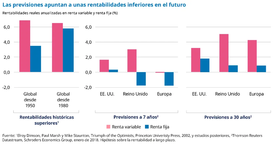 Sin embargo, las rentabilidades pasadas no garantizan rentabilidades futuras y puede que no vuelvan a repetirse. En este sentido, nuestro equipo de economistas señala que es probable que las rentabilidades futuras sean inferiores a las que obtuvimos en el pasado debido, principalmente, a dos razones: