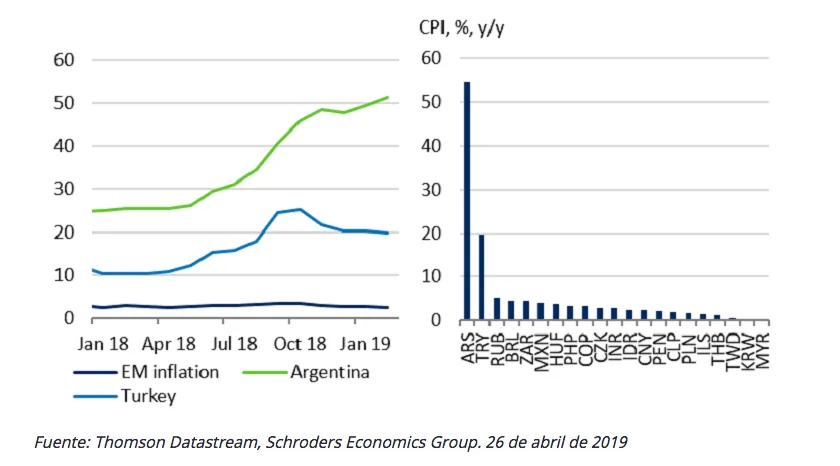 Los problemas de los dos países tienen algunas similitudes. Fundamentalmente, la inflación es una gran preocupación en ambas economías. La inflación en Argentina subió a 54,7% y en Turquía fue de 19,7% en marzo. Estos niveles están muy por encima del promedio de EM (mercados emergentes) y han estado subiendo en un momento en que la inflación en el resto de EM ha sido plana o en descenso.
