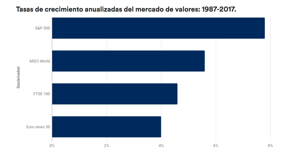Por esta razón, siempre lo más recomendable es apostar por el largo plazo. Como podemos ver en la siguiente tabla, en el período 1987-2017 ha habido altibajos pero la subida del S&P 500 ha sido del 7,8% anualizado desde 1987