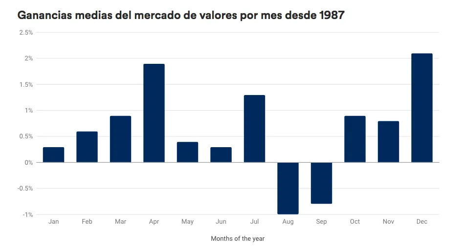 No solo se trata de la frecuencia de estas subidas en diciembre, sino también del volumen de las rentabilidades, ya que los mercados han subido un 2,1% de media en diciembre desde 1986. Es la ganancia más elevada de cualquier otro mes. En cambio, agosto ha sido el peor con caídas en torno al 1% de media.