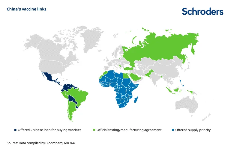 Como señalamos a principios de este año, es probable que tanto China como Rusia intenten llenar el vacío de vacunas en los mercados emergentes, causado en gran parte por el acaparamiento en los mercados desarrollados. China, en particular, ya había acordado en ese momento suministrar sus vacunas nacionales a la mayoría de los países de África y Latinoamérica, así como a partes de Asia y Europa.