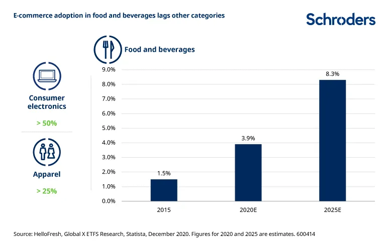 De hecho, aunque la pandemia ha provocado un fuerte crecimiento del comercio electrónico de alimentos, este crecimiento se ha producido desde niveles muy reducidos y sigue estando muy por detrás de otras categorías, como la ropa. En nuestra opinión, el potencial de crecimiento es significativo.