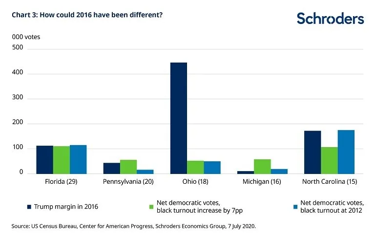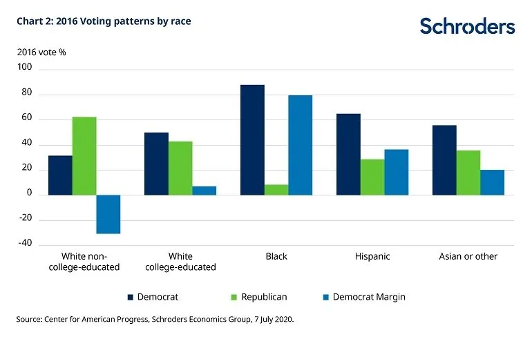 No podemos descartar que los republicanos también aumenten su participación en estas elecciones y proporcionen un impulso a Trump. Pero como el voto negro cayó particularmente de forma significativa en 2016, cuando consideramos el impacto del “Black Lives Matter” por sí solo, creemos que será más beneficioso para Biden en noviembre.