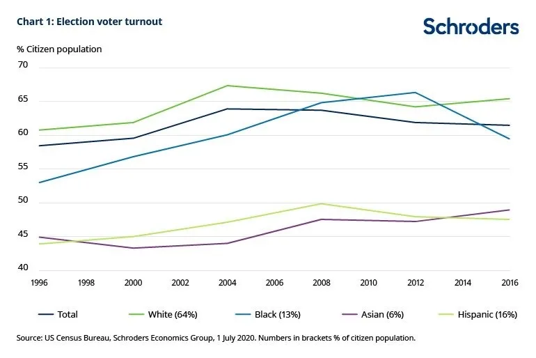 La cuestión de raza y la desigualdad racial siempre han sido un tema social importante en los EE.UU. Pero la muerte de George Floyd y el subsiguiente surgimiento del movimiento “Black Lives Matter” ha impulsado las relaciones raciales a la cima de la agenda política. Algunas encuestas sugieren que, en lo que se refiere a los temas de campaña, la cuestión racial está ahora a la par con la economía y la atención sanitaria. Es más, si los votantes negros se ven impulsados a votar el 3 de noviembre, nuestro análisis sugiere que podría significar el fin de la administración Trump. Los votantes negros son un grupo demográfico significativo para las elecciones, representando el 13% del electorado de EE.UU. Además, la participación de los votantes negros ha estado aumentando sin cesar hasta 2016, cuando cayó un 7%.
