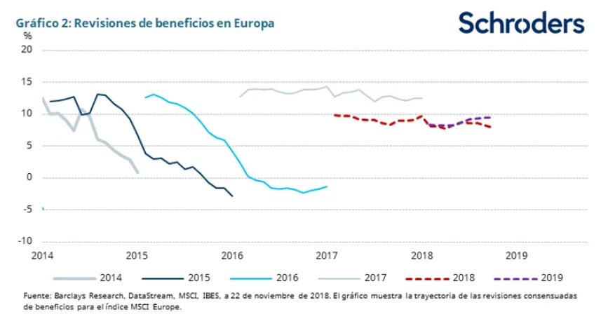 Los múltiplos de valoración descuentan unas perspectivas de beneficios prudentes. Las revisiones de los beneficios por acción han sido negativas y podrían seguir siéndolo, lo que corre el riesgo de constituir un obstáculo para la recuperación de los múltiplos. Además, existen factores geopolíticos que también ponen en riesgo dicha recuperación, como la guerra comercial, la situación en China o del dólar.