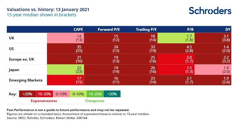 Sin embargo, ya hemos visto cómo la euforia de los inversores retail invadía los mercados. En esta ocasión, nuestra expectativa de que las vacunas proporcionarían una inyección para las acciones de recuperación ha demostrado ser así. Los mercados han subido bastante desde entonces y, como señalamos el mes pasado, las valoraciones de los principales mercados parecen caras en comparación con las bases históricas. [Véase más abajo, con descripciones detalladas de las métricas utilizadas aquí].