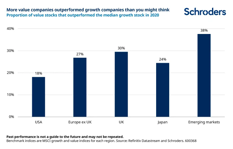 Las cifras son aún más sorprendentes en otros mercados. En los mercados emergentes, un impresionante 38% de las empresas value superaron a la mediana de las empresas de crecimiento. En Reino Unido, Europa sin Reino Unido y Japón, las proporciones fueron del 30%, 27% y 24%. Las empresas menos atractivas pueden generar ganancias igual de atractivas.