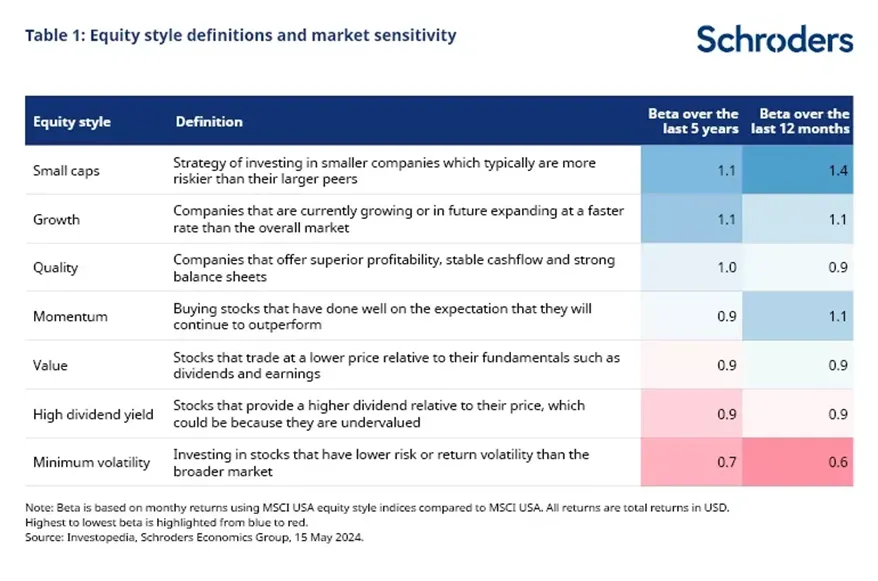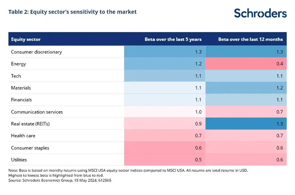 Por el contrario, los estilos cíclicos como los valores de pequeña capitalización (small caps) o los valores de crecimiento (growth), o sectores como el consumo discrecional y la energía, son más sensibles al comportamiento del mercado en general. Aunque la beta puede cambiar con el tiempo, como se observa en el sector energético, que se ha vuelto menos sensible al mercado general en los últimos 12 meses.
