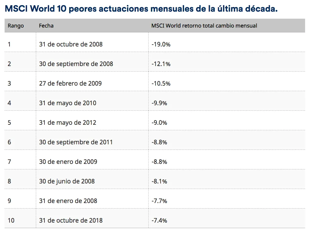 Octubre del 2018 ya es conocido como el 'octubre rojo'. Prueba de ello es que el MSCI World ha caído un 7,4% en octubre tras la inquietud causada por las guerras comerciales, la incertidumbre política en Europa y el fin de las políticas monetarias expansivas.