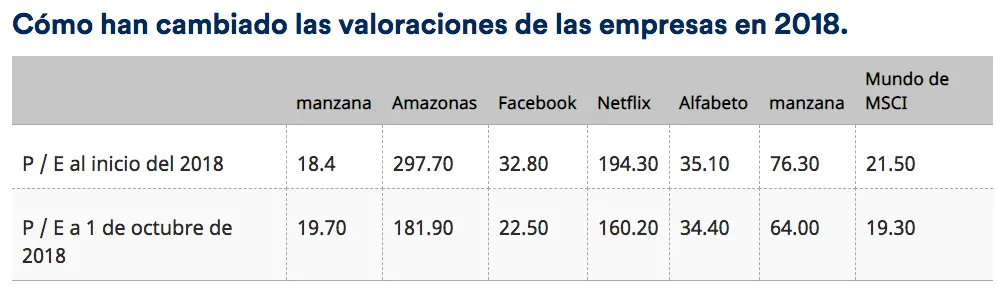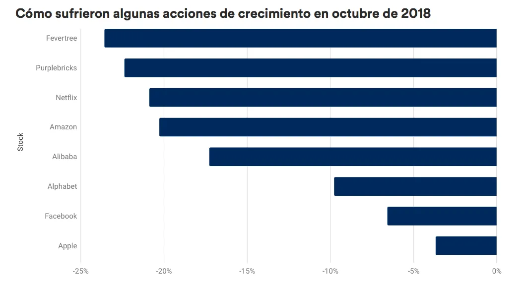 Las FAANG (Facebook, Amazon, Apple, Netflix, Google / Alphabet) tampoco se han librado de las caídas de octubre, junto con otras acciones que no paran de crecer como Alibaba, el equivalente chino de Amazon, o el fabricante de bebidas del Reino Unido Fevertree.