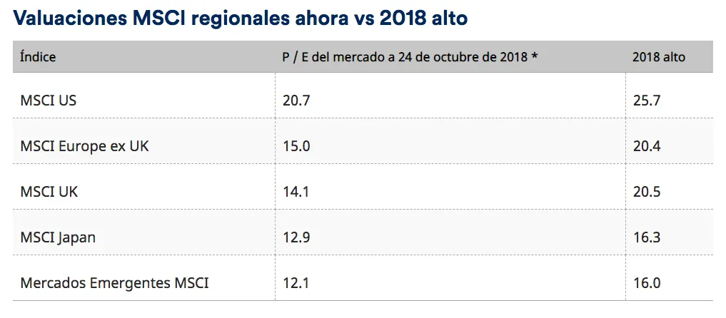 No obstante, esta caída ha hecho más atractivas las valoraciones de las acciones. Los índices de precio a ganancias (P / E) (una de las medidas de valoración más utilizadas) de todos los mercados principales se han reducido significativamente este año. Este índice se calcula dividiendo el valor o el precio de un mercado por el beneficio agregado por acción de todas las compañías en los próximos 12 meses. Un número bajo representa un mejor valor.