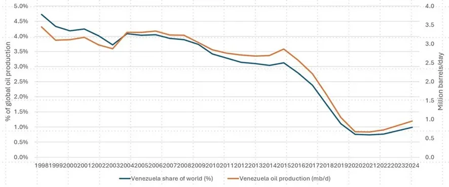 La relevancia estratégica de Venezuela se deriva de la magnitud de sus reservas, nominalmente las más grandes del mundo, y no de su producción actual, que representa menos del 1% del mercado. La producción ha caído desde los máximos de más de 3,5 millones de barriles diarios hasta alrededor de 1 millón de barriles diarios en la actualidad, tras décadas de mala gestión, falta de inversión y errores de gestión. El petróleo sigue representando más del 90% de las exportaciones venezolanas, lo que deja a la economía muy expuesta a los problemas del sector.