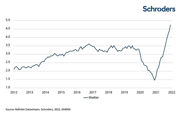 El siguiente gráfico muestra el espectacular aumento del coste de la vivienda en EE.UU. (denominado "refugio" por el IPC) desde principios de 2021. Los inversores residenciales pueden obtener una rentabilidad real, ya que sus flujos de efectivo siguen el ritmo de la inflación y, en algunos casos, la superan.