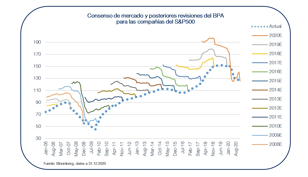 Como inversores, una de las primeras cuestiones a las que nos enfrentamos al analizar los diferentes mercados, sectores y compañías, es si existe la posibilidad de invertir con un cierto nivel de predictibilidad. Un primer acercamiento a esta incógnita, podría verse representado en lo que el consenso de mercado ha tratado de anticipar y lo que la realidad ha puesto de plano durante estos últimos años. Por ejemplo, si echamos un vistazo a las estimaciones del mercado para el BPA (beneficio por acción) de las compañías del S&P500 y lo comparamos con los resultados reales durante los últimos 15 años, observaremos no solo la dificultad sino también el peligro de intentar anticipar los movimientos y resultados de los mercados.