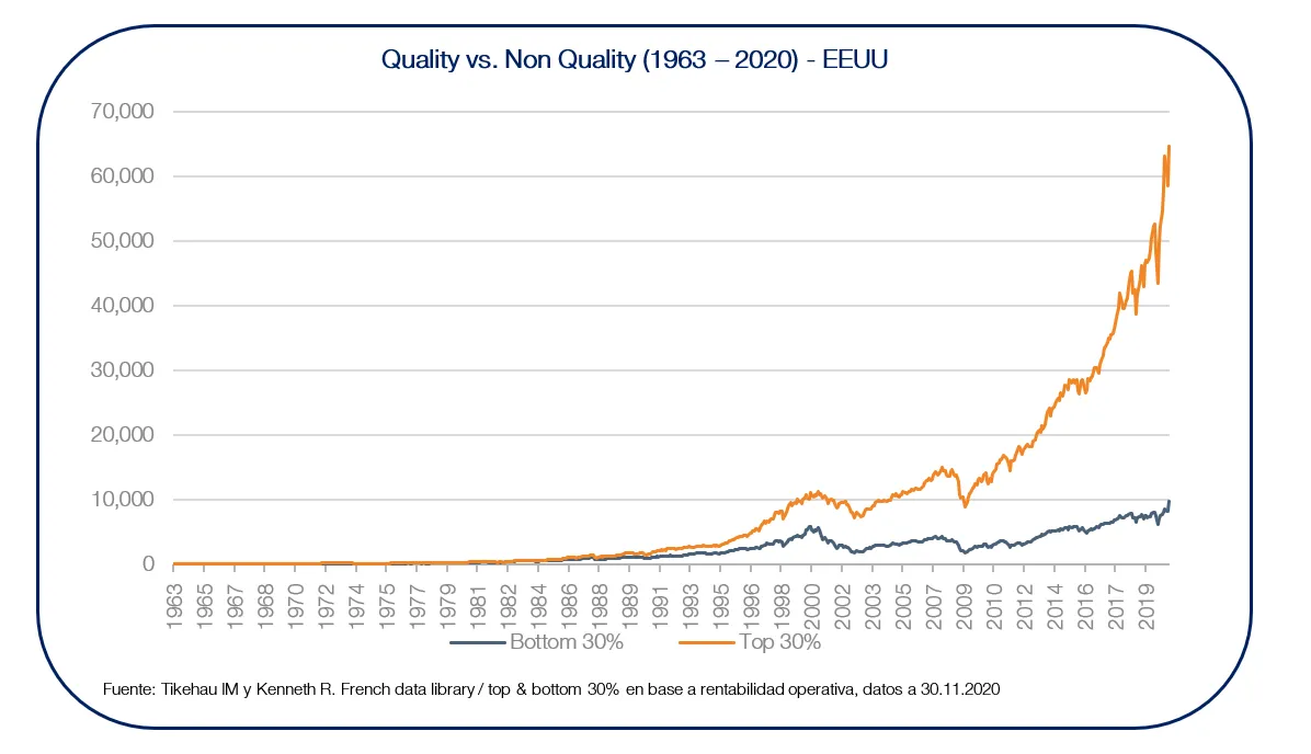 En este sentido, nuestro enfoque para los mercados de renta variable no se basa en tratar de predecir los movimientos en las curvas de tipos, la inflación, las condiciones macroeconómicas o las valoraciones de las cotizadas, sino en identificar compañías que sean intrínsecamente sólidas, con poca sensibilidad a los factores externos y resistentes a los distintos ciclos económicos. Este particular grupo, capaz de generar valor y retornos sostenibles y consistentes a lo largo del tiempo, es lo que definimos como compañías de calidad. No obstante, identificar este tipo de firmas requiere un extenso análisis en profundidad, y un riguroso y disciplinado enfoque que pocos inversores están dispuestos a adoptar.