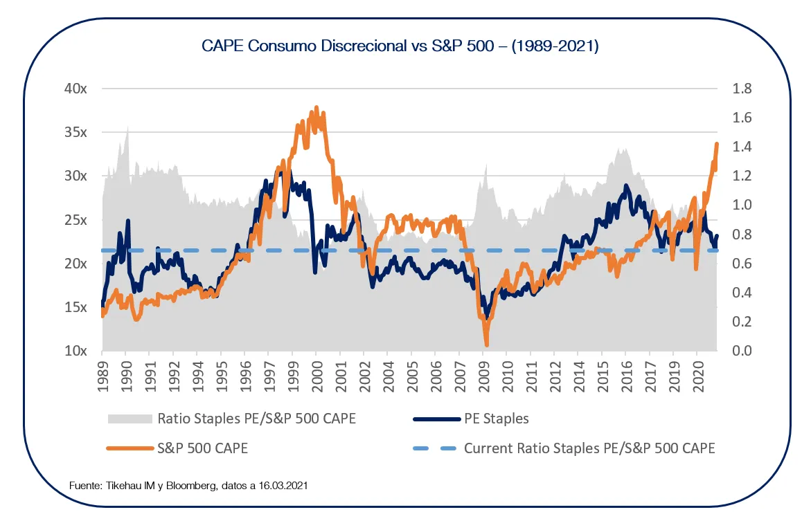 Desde 1989, de media, la cesta de acciones seleccionadas ha cotizado en unos múltiplos en línea con el mercado. Sin embargo, es cierto que gracias a su naturaleza defensiva, las empresas de consumo discrecional tienden a cotizar en múltiplos más elevados en momentos de cierta incertidumbre, como podemos ver en las recesiones de 1991, 2001 y 2008. Por el contrario, en periodos de euforia generalizada, la expansión no suele ser tan notable como la del mercado, como reflejan los periodos previos a la crisis de 2000 o 2009 y el actual momento de mercado, desde el anuncio de la aprobación de las vacunas en noviembre del año pasado.
