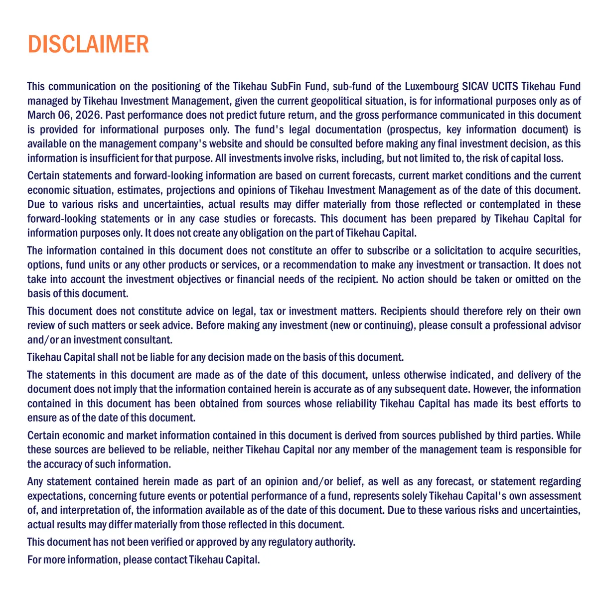 A modo de recordatorio, la estrategia de posicionamiento actual de Tikehau SubFin Fund se centra principalmente en el carry y tiene como objetivo limitar los riesgos de duración y de volatilidad.