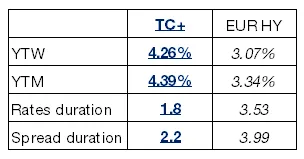 En línea con nuestro posicionamiento y visión de mercado la duración del fondo es la mitad que la del índice HY. A pesar de esto, TC+ cuenta con una YTW un 40% superior al índice: