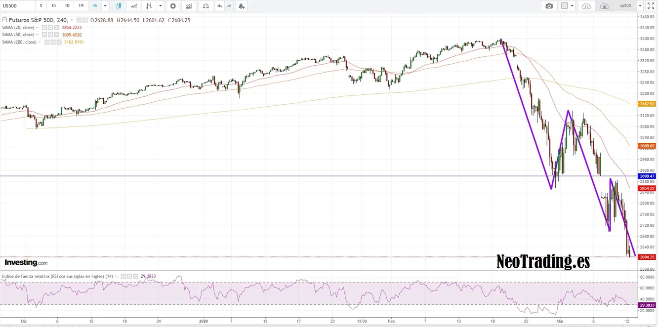 Como se puede observar en el gráfico, la caída del SP500 está ahora mismo en la quinta onda. Habitualmente esta “última” onda suele ser la más larga y también previa a un importante rebote.