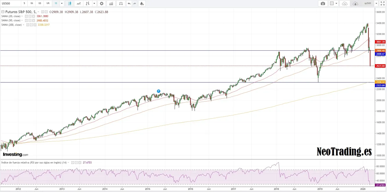 En vista de que seguimos inmersos de lleno en plena crisis sanitaria del COVID-19, a continuación vamos a analizar dos posibles escenarios en la renta variable estadounidense y por ende extensible a la mundial. Como ya hemos comentamos previamente, en coyunturas de alta volatilidad como los que estamos viviendo en estos momentos, hacer un pronóstico acertado es complicadísimo, mucho más que en condiciones normales, ya que la incertidumbre es total, todavía no se sabe con certeza si la epidemia está controlada, si seguirá creciendo y cuál será su impacto real en la sociedad y en la economía, por lo que intentar prever algo así es una tarea extremadamente complicada para cualquiera.