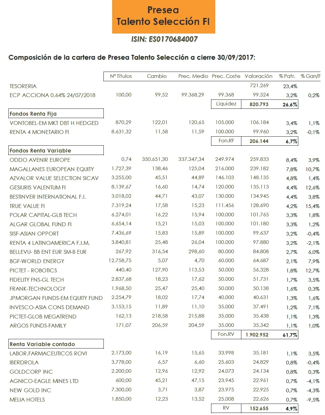 Se cierra un trimestre más de este 2017 con las vistas ya puestas en el turrón. En este mes Presea Talento se ha revalorizado un +1,64%, consiguiendo en el tercer trimestre del año una suma de +2,59%.