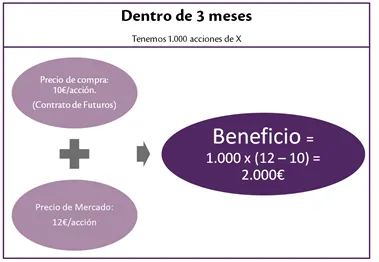 Si se cumplen nuestras expectativas de aumento en el precio de las acciones en tres meses, el precio de mercado de las acciones es superior al precio fijado en el contrato de futuros, por ejemplo 12€/acción, podemos obtener un beneficio de 2€/acción si vendemos las acciones en el mercado.