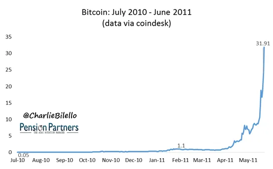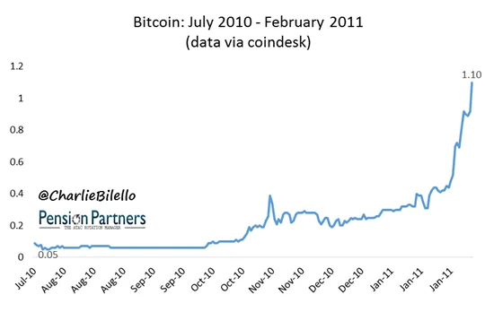 En febrero de 2011 el bitcoin cotizaba a 1,10 lo que significa una revalorización del 2100% desde sus orígenes y la palabra burbuja empezó a hacer presencia en los medios..