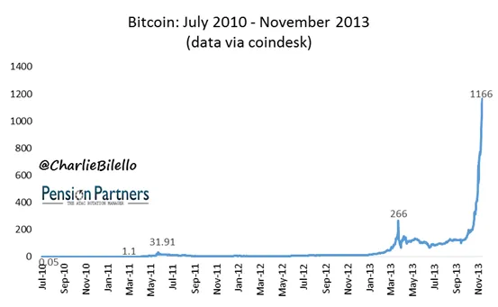 Algunos pensaban que esto no podía seguir así y desde ese punto sufrió otra importante caída del 76% hasta 63 pero no solo recuperó todo lo perdido sino que ascendió otro 338% adicional sobre sus máximos previos hasta 1166 en noviembre del 2013.