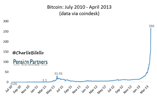 Algunos pensaban que era una burbuja nunca vista y desde ahí se produjo una caída del 94%, pensando muchos que el bitcoin era historia. No solo no fué así sino que además de recuperarlo todo, subió un 734% adicional frente a sus máximos anteriores hasta 266 en abril del 2013.