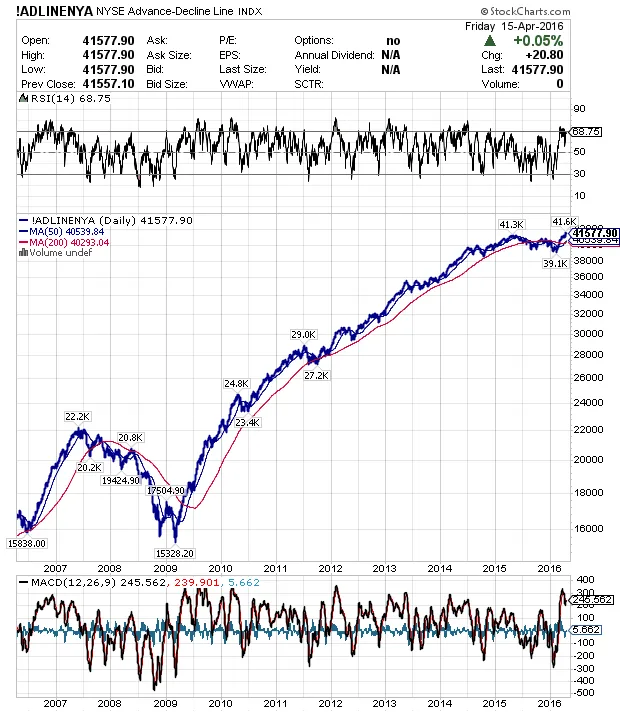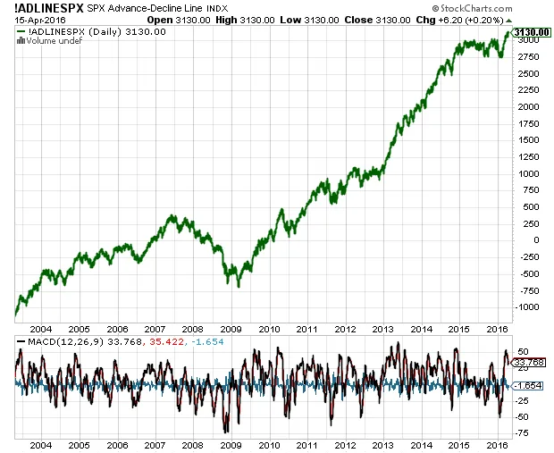 Durante los casi dos años que llevamos de lateral, uno de los argumentos más utilizados por los bajistas para justificar una posible caída importante de los mercados ha sido el deterioro de la amplitud de mercado reflejado en la línea avance/descenso. Ya comenté en su día que no es un indicador fiable para operar porque aunque finalmente tuviera razón, dicha divergencia puede durar años. Tras muchos meses de divergencia, podemos dar ese argumento bajista por finalizado puesto que ya se están viendo de nuevo máximos históricos en la línea avance descenso de los principales índices.