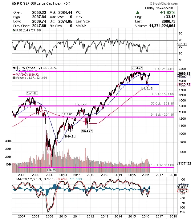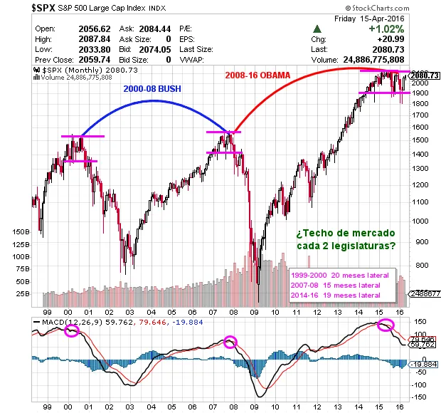 Una vez llegado hasta aquí, habiendo recuperado casi todo lo perdido y a unos pocos meses de elecciones en EEUU es probable que la FED y el gobierno hagan lo posible para que los mercados lleguen en buenas condiciones a las elecciones. Eso no quita para que en breve entremos en la etapa del "sell in may and go away" o que el Brexit o la ausencia de gobierno en España puedan provocar algún que otro bache por el camino pero las probabilidades de que este eterno lateral se rompa por el lado alcista van incrementando.