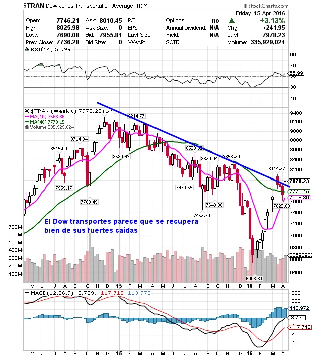 Otra de las divergencias mas importantes como era la evolución del Dow Transportes parece que está mejorando mucho y está recuperando bastante desde sus mínimos.