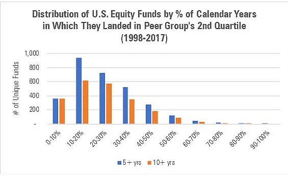 Los analistas de Morningstar examinaron las rentabilidades por año natural de más de 4.800 fondos de renta variable americana domiciliados en Estados Unidos durante el periodo comprendido entre 1998 y finales de 2017, incluyendo los fondos que desaparecieron en el camino. Los fondos fueron clasificados para cada año natural en función de sus rentabilidades respecto a la media de su categoría. Luego se calculó el número de veces que cada fondo terminó en la mitad superior de su categoría y eso a lo largo del periodo de análisis de 20 años.