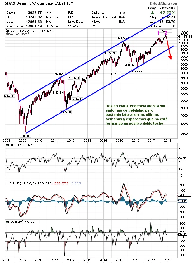 En definitiva, no hay que ir contra tendencia, de momento mercado alcista pero hay algunas muestras de cansancio que nos hacen pensar que si el mercado forma alguna figura de vuelta puede ser para ver la mayor corrección desde 2009 pero hasta que eso ocurra pueden pasar meses y tendremos tiempo de ir comentando la situación. Años tan positivos y relajados como 2017 sin una sola caída del 5% en todo el año es algo a lo que es mejor no acostumbrarse.