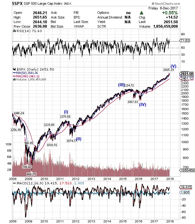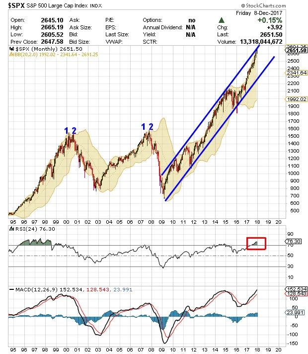 LLegadas estas fechas del año en las que habitualmente empiezan a aparecer las previsiones para el año que viene podemos ir comentando si es momento de comprar, mantener o vender. Aunque la tendencia de Wall St sigue siendo impecablemente alcista sin sintomas de agotamiento ni figuras de vuelta, habiendo sido alcista desde hace bastante tiempo , desde febrero de 2016 que consiteré el periodo de consolidación lateral agotado con importantes posibilidades de continuación de tendencia alcista hasta ahora me he mantenido alcista en todo momento y ahora no me vuelvo de repente bajista pero, sencillamente no aumentaría posiciones en renta variable por el momento por considerar que este último tramo alcista ya va estando maduro por diferentes motivos que ahora comento.