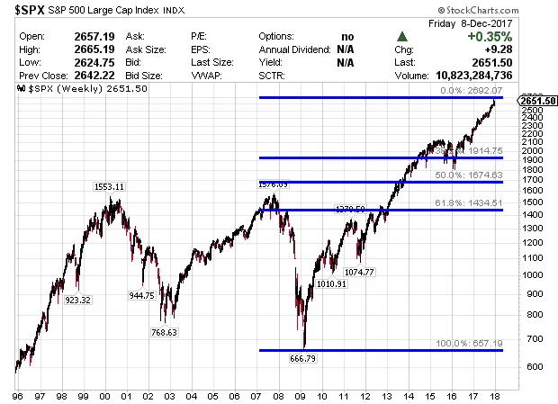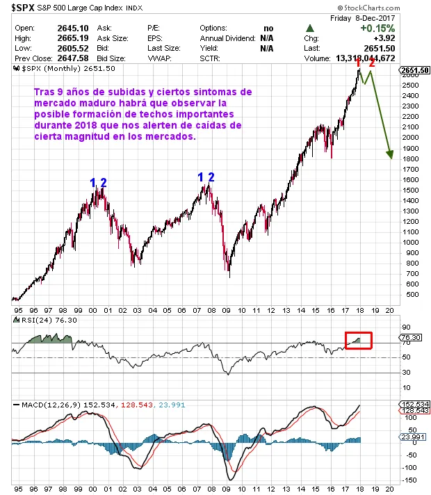 ¿Entonces qué hacemos en 2018? Como he comentado el mercado va estando maduro, 9 años consecutivos alcistas son muchos y cuando lleguen las caídas puede que sean las más importantes que hemos visto desde 2009 aunque eso no quiere decir que se rompa la tendencia alcista de fondo, pero una caída del 38,2 de fibonacci para corregir todo lo subido sería de importante magnitud después de lo subido desde 2009. Una caída de algo mas del 38 supondría perder todo los ubido desde los mínimos de 2016 y si se fuera al 50 podría irse a apoyarse como soporte en los máximos históicos de 2000 y 2007