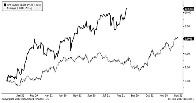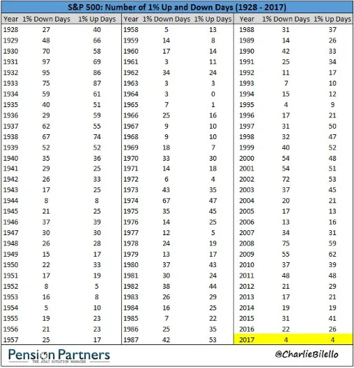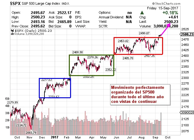 Tras el paréntesis veraniego sin ningún susto a resaltar mas allá de algún día de caídas con caídas que han superado el 1% en uno de los años de la historia con menos movimientos bruscos como se puede ver en la siguiente tabla nos incorporamos al nuevo curso con un mercado que no da ninguna muestra de debilidad.