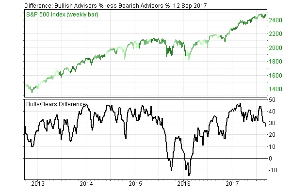 El sentimiento de mercado de investors intelligence se ha moderado significativamente durante el verano dejando posibilidad de continuar subiendo por haber salido de la zona de sobreoptimismo.