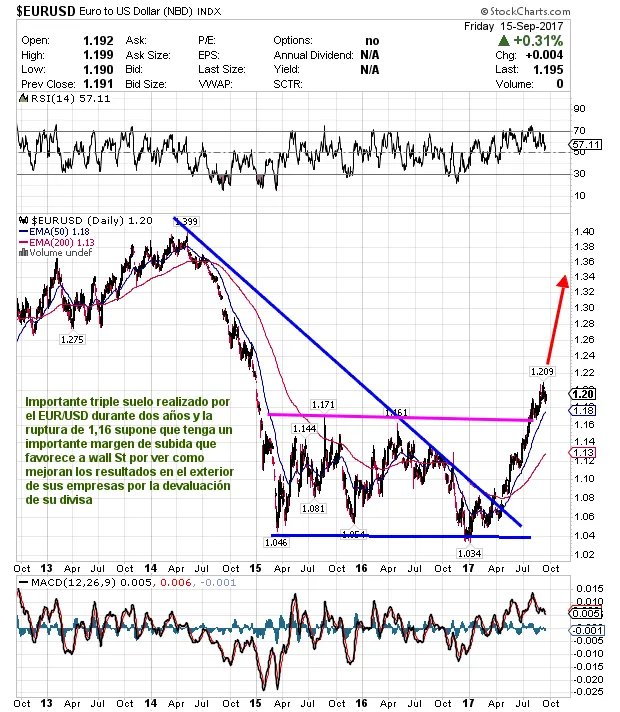 El eur/usd ha roto su importante soporte de 1,16 con bastante margen de subida y beneficiando subidas adicionales en wall St