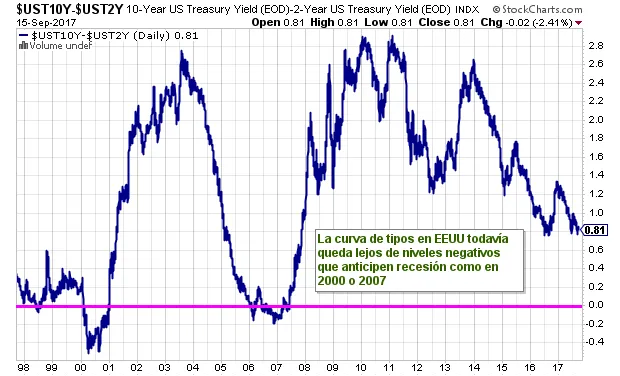 La curva de tipos queda todavía bastante lejos de los niveles que suelen orientar de posible recesión a la vista.