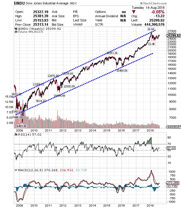 El Dow jones ha corregido de forma moderada alejándose de la parte superior del canal alcista a la que llegó en febrero.