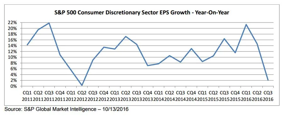 Especial atención debe prestarse al sector consumo discrecional ya que está camino de comunicar sus resultados trimestrales que serán los más bajos desde el año 2012 como muestra el gráfico:
