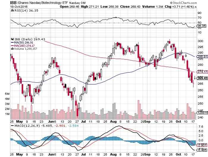 Algunos analistas estiman que el mercado biotecnológico es "el canario en la mina de carbón". Este sector está comenzando a perder mucha fuerza después del impresionante tramo alcista de los últimos meses. Así, el iShares Nasdaq Biotechnology ($IBB) ha caído por debajo de los promedios móviles de 50 y 200 periodos lo cula se interpreta como una señal bajista.