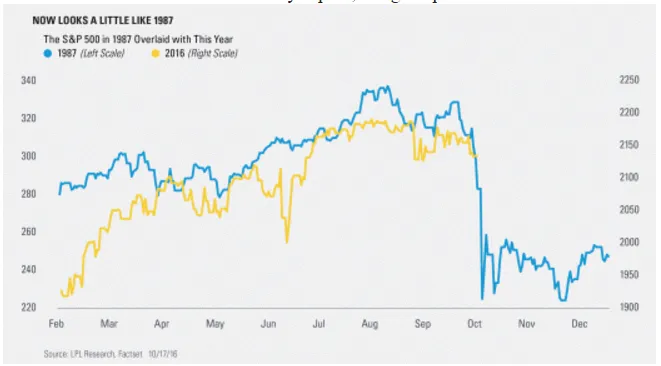 Coincidiendo con esas fechas no han faltado los que comienzan a ver paralelismos con la situación actual. Así Murray Gunn, analista de HSBC, estima que la pérdida de los niveles de 2116-1991 en el S&P 500 o el área de los 17.992-17.063 en el Dow Jones podría desencadenar una oleada de ventas masivas. Por su parte Ryan Detrick, analista de LPL Financial, considera que si bien es cierto que pueden existir ciertos paralelismos entre 1987 y 2016 no lo es menos que hay muchas diferencias significativas ( como veremos posteriormente).