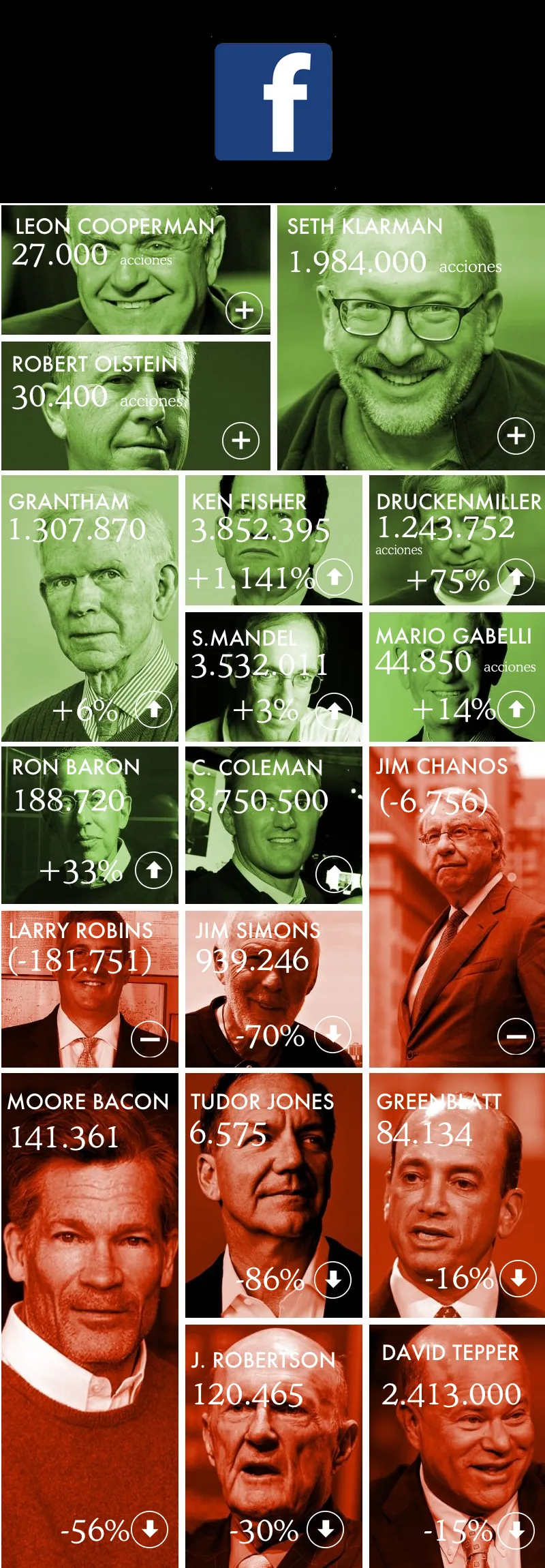 Para este artículo he realizado 5 gráficos para que, de una forma muy visual, podamos ver las posiciones de los grandes gestores de Hedge Funds ante las acciones FAANG. Hemos incluido también a Bill Gates porque, pese a que obviamente no es un gestor de Hegde Funds, sus dos brazos inversores ( Cascade Investment LLC y Bill & Melinda Gates Foundation) están a la altura de los más grandes, reputados e influyentes fondos.